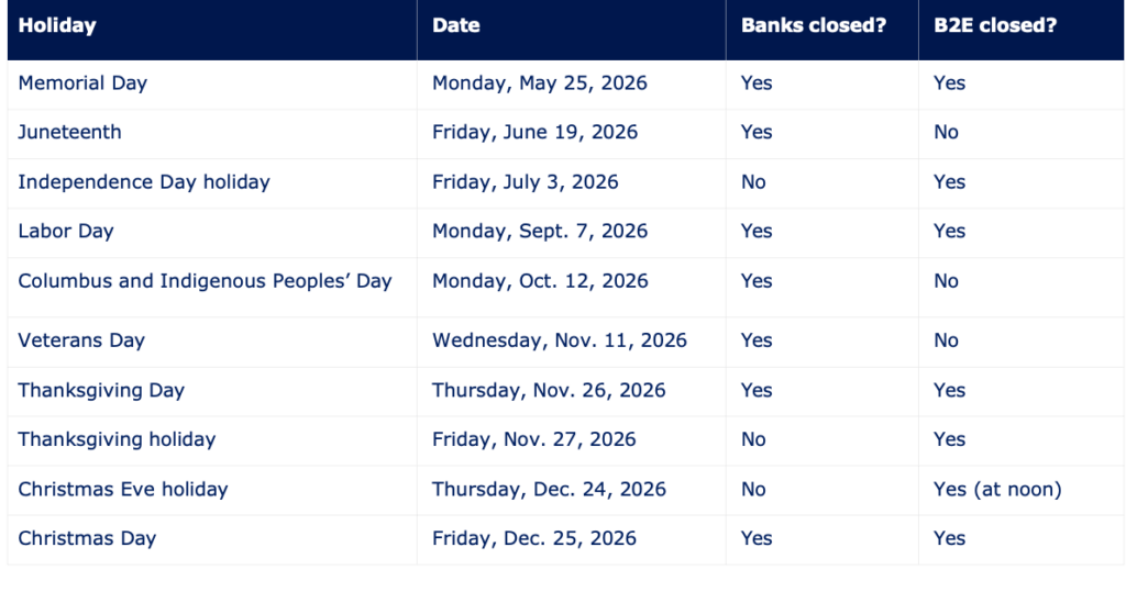 Please be aware of upcoming closings (including your own), as you may need to reschedule pay dates and/or processing dates to ensure timely payroll delivery.