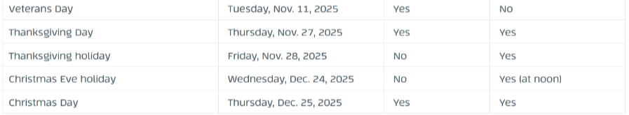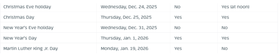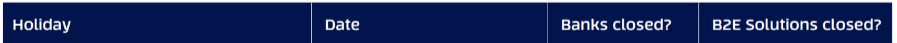 Please schedule your payroll processing and pay dates around bank closings and be aware of upcoming B2E Solutions closings, so you do not encounter unexpected delays.